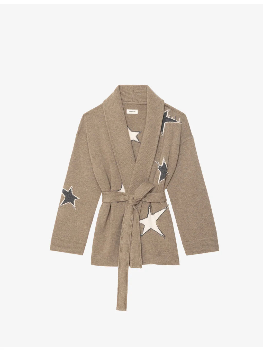 PRODUCT DETAILS - Zadig&Voltaire wool and cashmere jacket - 90% merino wool, 10% cashmere - Self-tie fastening - Relaxed fit, shawl lapels, dropped shoulders, long sleeves, belted waist, all-over star pattern - Hand wash - True to size - Model is 5ft 11in/1.80m and wears a size XS/small - Heavyweight, slight stretch Ref: R04556085
