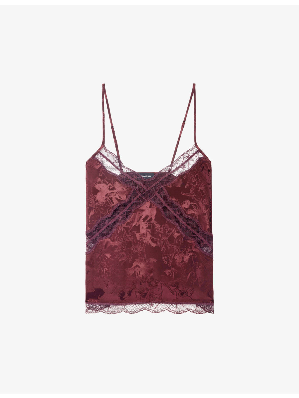 PRODUCT DETAILS - Zadig&Voltaire silk camisole - 100% silk - Regular fit, V-neck, thin straps, sleeveless, jacquard horses pattern, lace trim - Machine wash mild - True to size - Model is 5ft 10in/1.78m and wears a size small - Lightweight, non-stretch Ref: R04509351