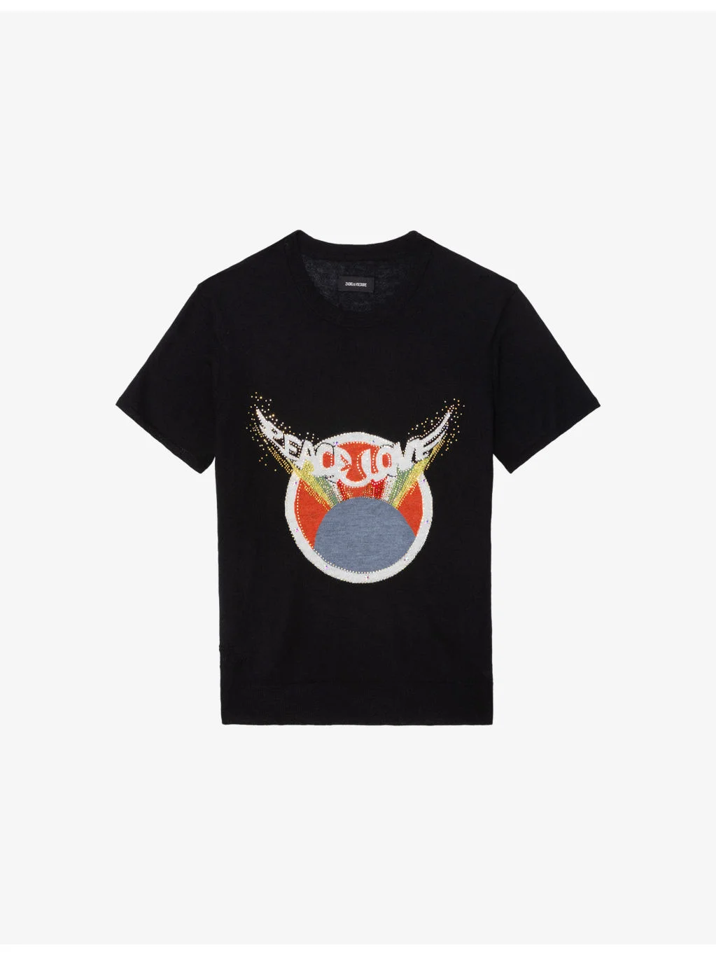 PRODUCT DETAILS - Zadig&Voltaire cashmere T-shirt - 100% cashmere - Regular fit, round neck, short sleeves, ‘peace love’ intarsia to front, rhinestone embellishments at front - Hand wash - True to size - Model is 5ft 11in/1.80m and wears a size small - Midweight, non-stretch Ref: R04602672