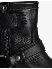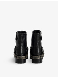 PRODUCT DETAILS - Zadig&Voltaire leather ankle boots - 100% leather - Zip fastening - Closed square toe, ankle length, topstitching at front, O-ring with harness straps at side, chain embellishment at back, metal wings embellishment to chain, textured panel at heel - Heel height 1.77” - Specialist leather clean - Made in Spain - Upper: 100% leather - Lining: 100% leather - Sole: 100% rubber Ref: R04400640