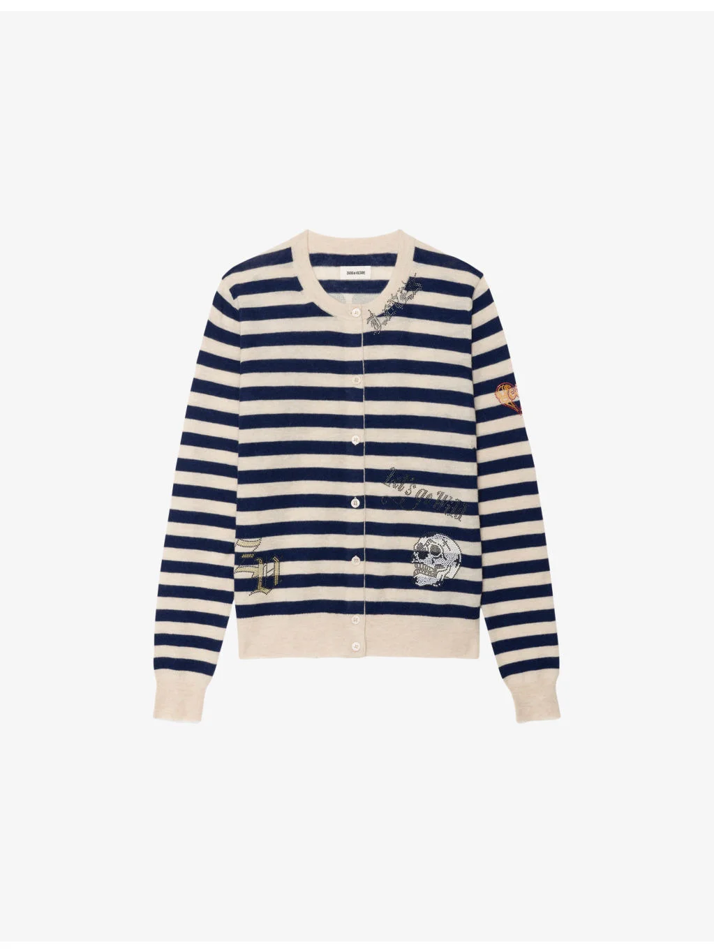 PRODUCT DETAILS - Zadig&Voltaire cashmere cardigan - 100% cashmere - Button fastening - Regular fit, round-neck, long sleeves, branded rhinestone motifs, all-over striped pattern - Hand wash - True to size - Model is 5ft 10in/1.78m and wears a size small - Midweight, slight stretch Ref: R04619929