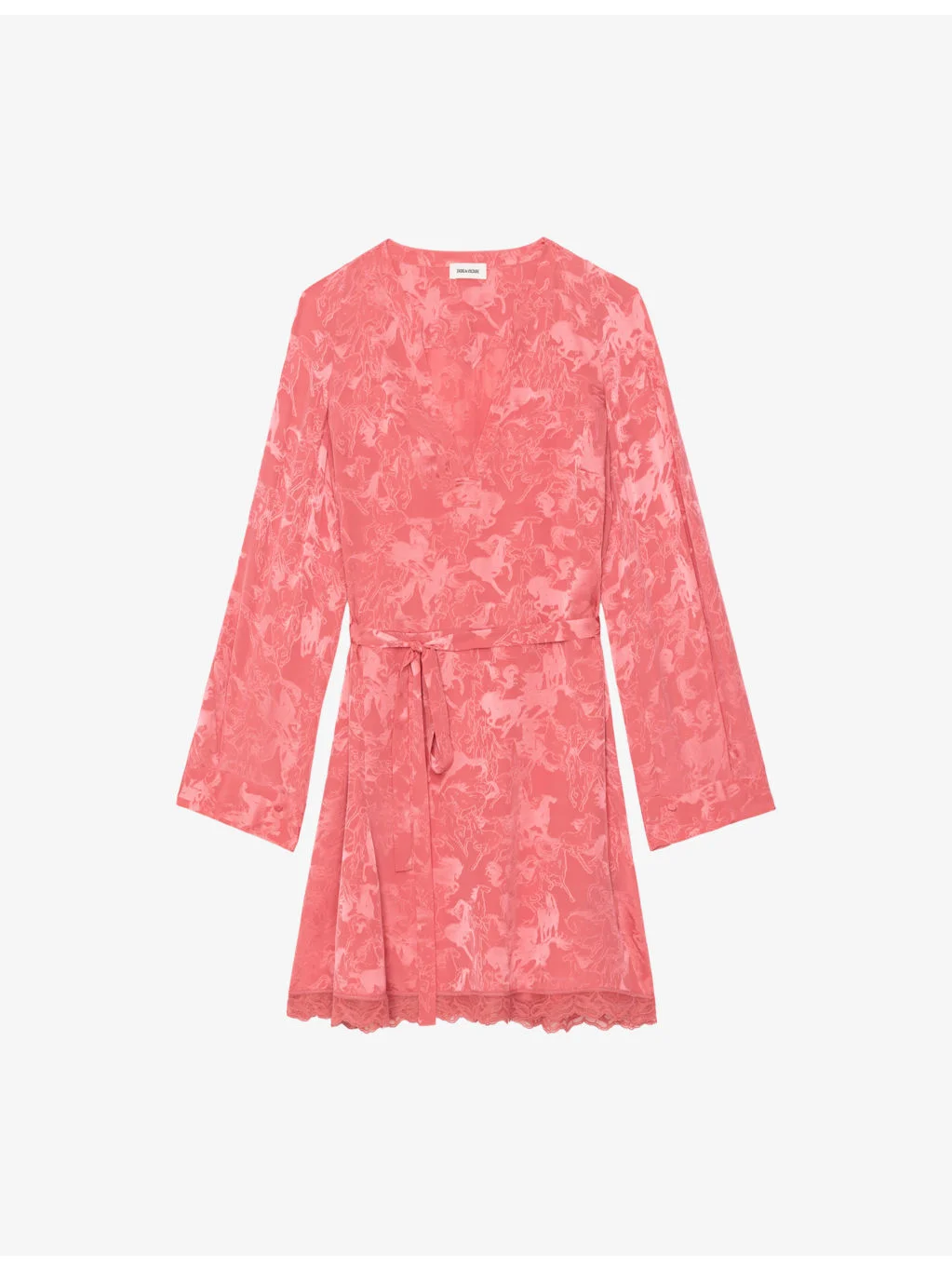 PRODUCT DETAILS - Zadig&Voltaire silk mini dress - 100% silk - Relaxed fit, V-neck, long sleeves, all-over horse jacquard pattern, wrap front, self-tie detail at waist, buttoned cuffs, wings embroidery at back, scalloped lace trim at hem - Hand wash - True to size - Model is 5ft 11in/1.80m and wears a size UK 8 - Lightweight, non-stretch Ref: R04602669