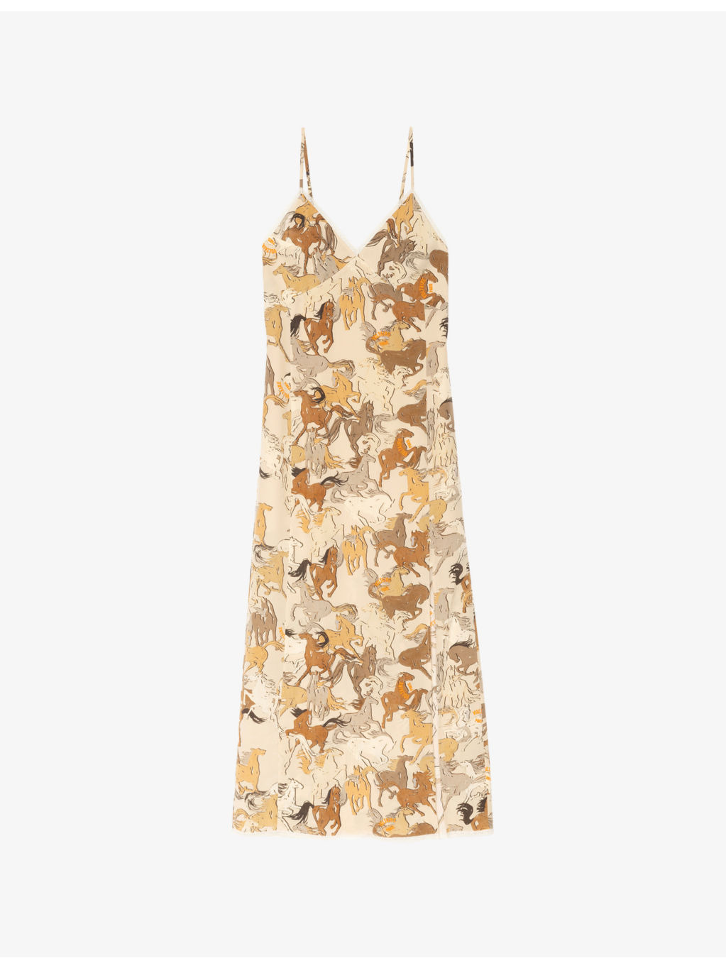 PRODUCT DETAILS - Zadig&Voltaire silk midi dress - 100% silk - Regular fit, V-neck, adjustable straps, sleeveless, lace trim, all-over horse pattern - Hand wash - True to size - Model is 5ft 10in/1.78m and wears a size small - Lightweight, non-stretch Ref: R04541414