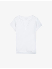 PRODUCT DETAILS - Zadig&Voltaire cotton T-shirt - 100% cotton - Exposed button fastening at front - Regular fit, buttons at the neck, short sleeves, ‘Be Kind To Your Mind’ message hidden inside - Machine wash cold - True to size - Model is 5ft 9in/1.75m and wears a size small - Lightweight, non-stretch Ref: R04353718