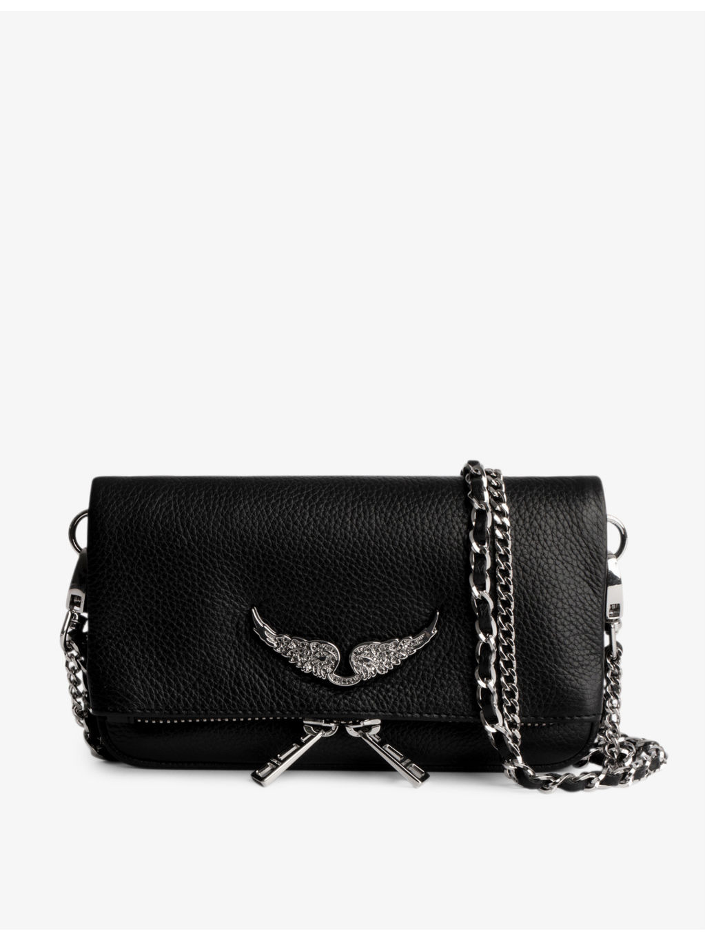 PRODUCT DETAILS - Zadig & Voltaire leather shoulder bag - 100% leather - Magnetic fastening - Rectangular shape, detachable double shoulder chain straps, removable brand metal wings at front, one main compartment, internal slip pocket, branded silver-toned hardware, soft grain texture - Specialist leather clean - Height 13cm, width 27cm, depth 2cm - Comes with dust bag Ref: R04090577