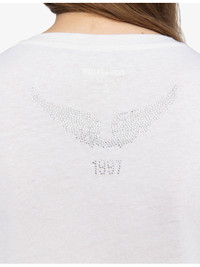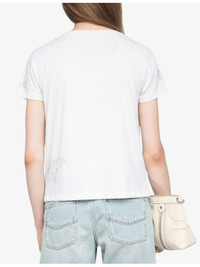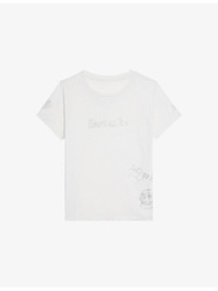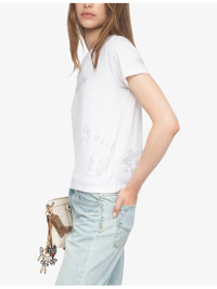 PRODUCT DETAILS - Zadig&Voltaire cotton-blend T-shirt - 50% polyester, 30% cotton, 20% linen - Regular fit, round neck, short sleeves, all-over rhinestone embellished inscriptions - Machine wash at 30°C - True to size - Model is 5ft 10in/1.78m and wears a size small - Lightweight, non-stretch Ref: R04496103