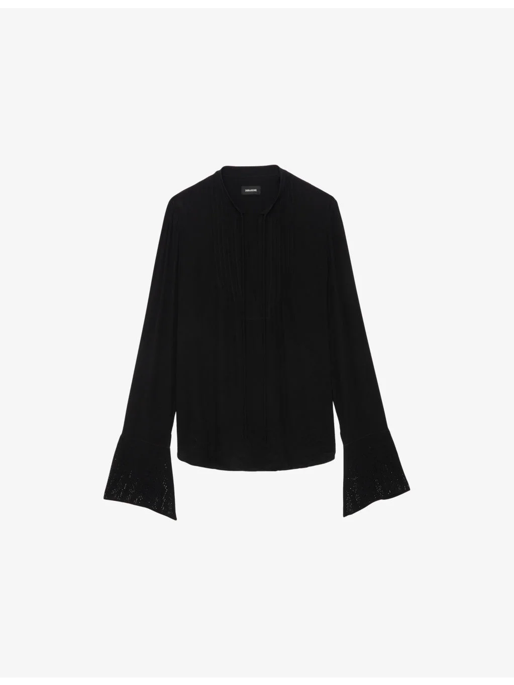 PRODUCT DETAILS - Zadig&Voltaire woven blouse - 100% viscose - Slips on - Regular fit, open collar, tie neck, long fluted sleeves, diamante-embellished cuffs, gathered details - Hand wash - True to size - Model is 5ft 9in/1.75m and wears a size small - Lightweight, non-stretch Ref: R04435808