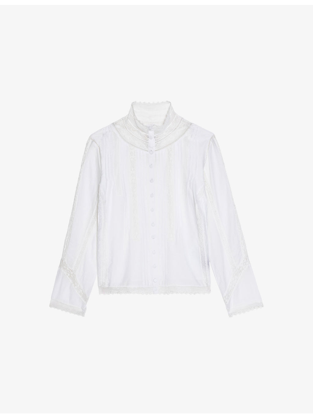 PRODUCT DETAILS - Zadig&Voltaire cotton-blend shirt - 75% cotton, 25% viscose - Exposed button fastening at front - Regular fit, high neck, long sleeves, all-over lace inserts, pintuck pleated panels, wings embroidery at back - Hand wash - True to size - Model is 5ft 9in/1.75m and wears a size small - Lightweight, non-stretch Ref: R04489489