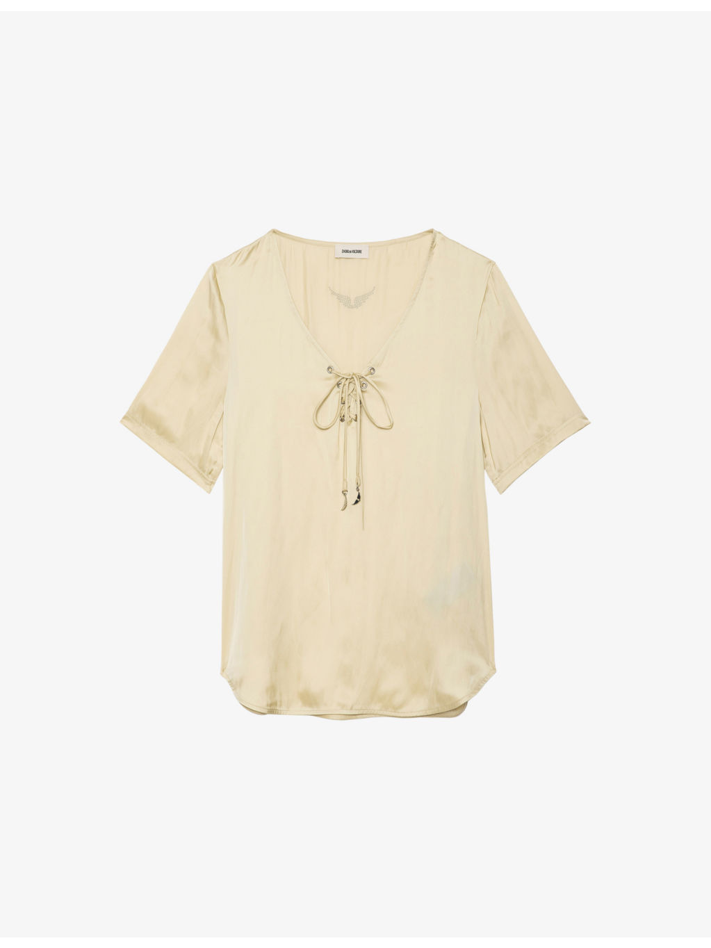 PRODUCT DETAILS - Zadig&Voltaire satin top - 100% polyester - Relaxed fit, V-neck, short sleeves, dropped shoulders, lace-up neckline, self-tie detail at neckline with wings hardware, satin texture, rhinestone-embellished wings branding at back - Hand wash - True to size - Model is 5ft 10in/1.78m and wears a size small - Lightweight, non-stretch Ref: R04502998