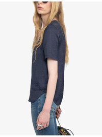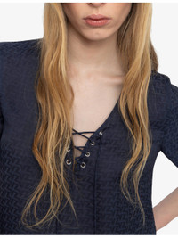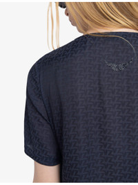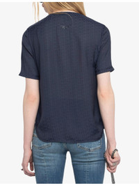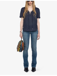PRODUCT DETAILS - Zadig&Voltaire woven top - 100% polyester - Relaxed fit, V-neck, short sleeves, dropped shoulders, lace-up neckline, self-tie detail at neckline with wings hardware, all-over ‘ZV’ monogram print, rhinestone-embellished wings branding at back - Hand wash - True to size - Model is 5ft 9in/1.75m and wears a size small - Lightweight, non-stretch Ref: R04501334