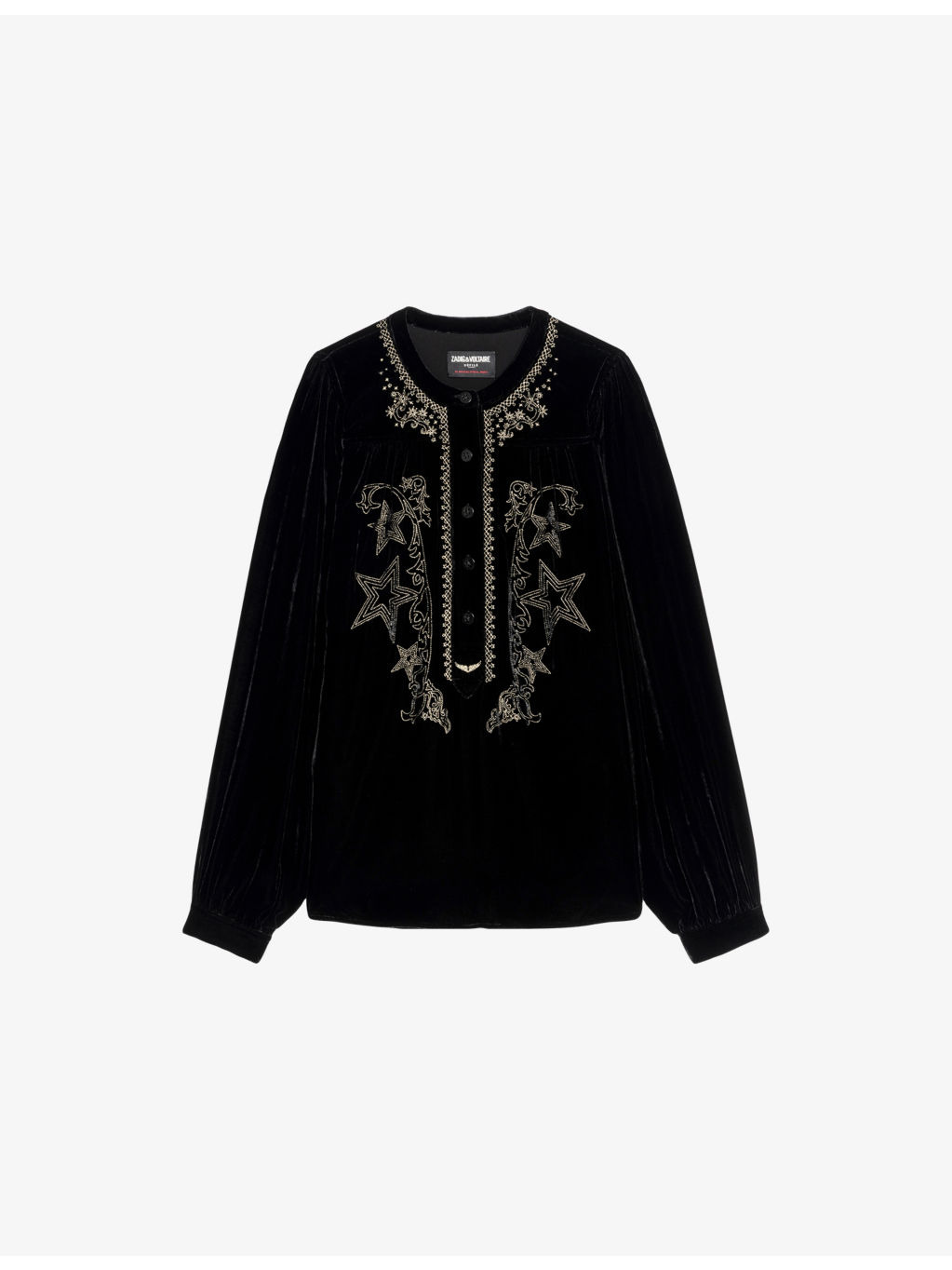 PRODUCT DETAILS - Zadig&Voltaire velvet blouse - 80% viscose, 20% silk - Exposed button fastening - Regular fit, round neck, long sleeves, all-over embroidery, gather and pleat detail at the back - Hand wash - True to size - Model is 5ft 10in/1.78m and wears a size small - Midweight, non-stretch Ref: R04531438