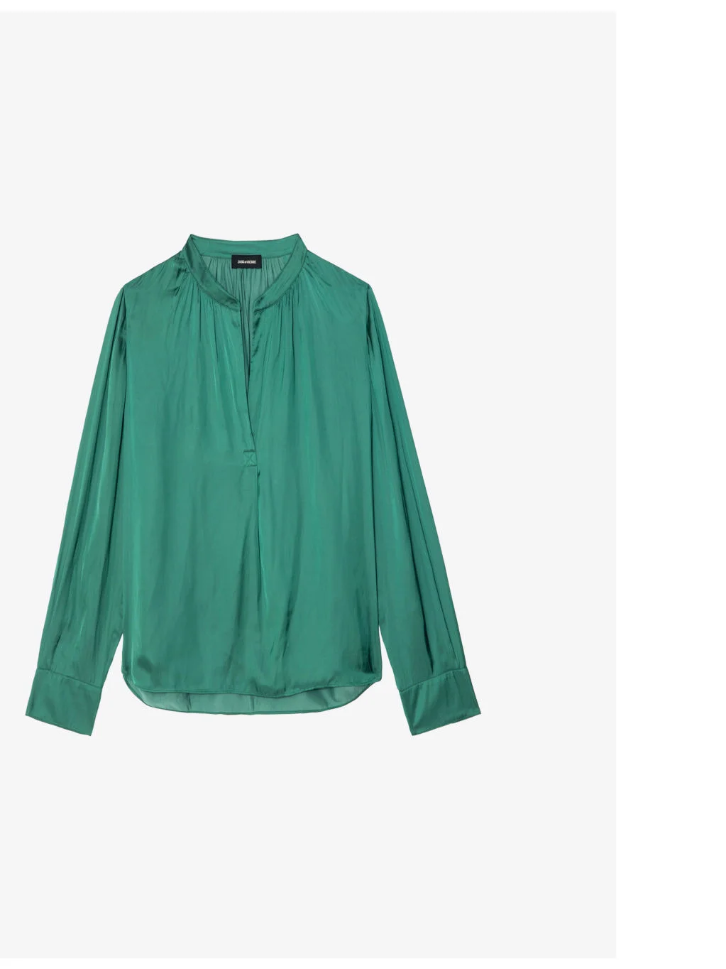 PRODUCT DETAILS - Zadig & Voltaire satin shirt - 100% polyester - Slips on - Mandarin collar, V-neck, long sleeves, single-buttoned barrel cuffs, gathered at back neck - Hand wash - True to size - Size small: Length 24in / 61cm - Lightweight, non-stretch Ref: R03909237