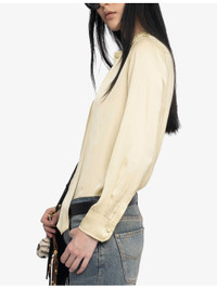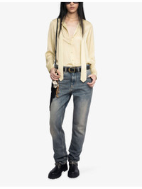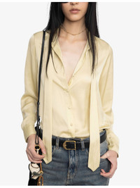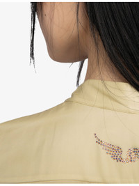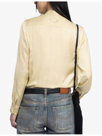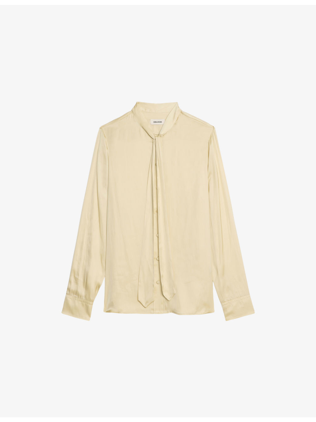 PRODUCT DETAILS - Zadig&Voltaire satin shirt - 100% polyester - Exposed button fastening at front - Slim fit, self-tie collar, long sleeves, satin texture, buttoned cuffs, rhinestone-embellished wings branding at back - Hand wash - True to size - Model is 5ft 10in/1.78m and wears a size small - Lightweight, non-stretch Ref: R04502997