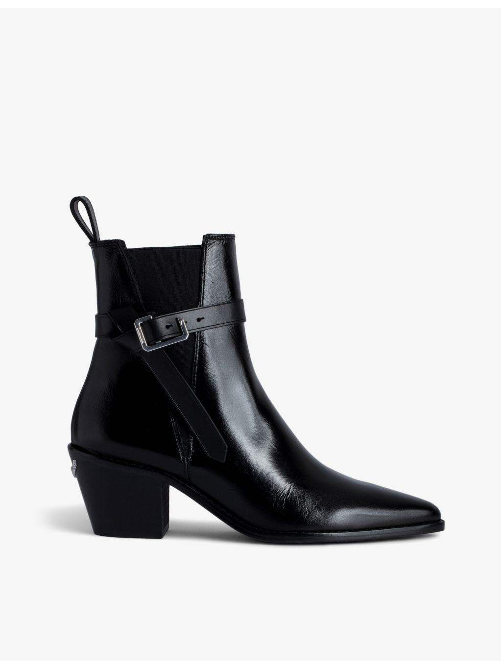 PRODUCT DETAILS - Zadig&Voltaire leather ankle boots - 100% leather - Pulls on - Pointed toe, closed toe, block heel, adjustable strap, C-shaped hardware buckle, logo engraved, elasticated side panels, pull tabs, logo plaque at heel, branded insole - Heel height 2.3"" - Specialist leather clean - Made in Spain - Upper: 100% leather - Lining: 100% leather - Sole: 100% leather Ref: R04217657