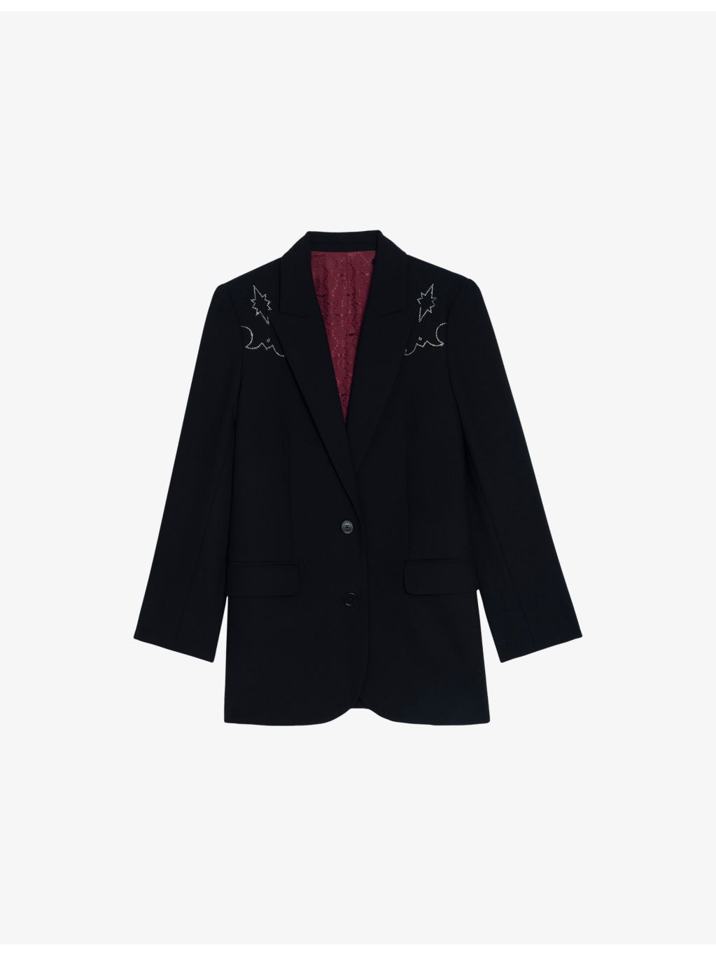 PRODUCT DETAILS - Zadig&Voltaire stretch-woven blazer - 69% polyester, 23% viscose, 8% elastane - Exposed button fastening at front - Oversized fit, notch lapels, long sleeves, padded shoulders, western-inspired rhinestone details at front and back, two flap pockets at front, notched cuffs, single vent to back hem - Dry clean only - True to size - Model is 5ft 9in/1.75m and wears a size UK 8 - Midweight, slight stretch Ref: R04493865