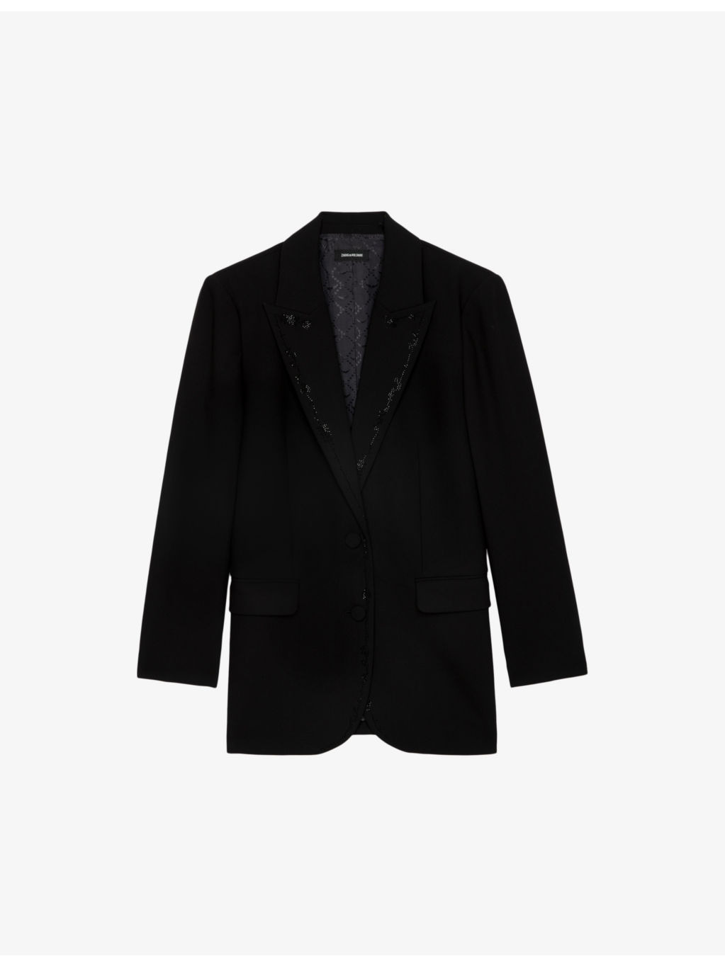 PRODUCT DETAILS - Zadig&Voltaire stretch-woven blazer - 69% polyester, 23% viscose, 8% elastane - Exposed button fastening at front - Regular fit, single-breasted, notch lapels, padded shoulders, long sleeves, split cuffs, one piped chest pocket, two side flap pockets, central rear vent, rhinestone embellishments - Dry clean only - True to size - Midweight, non-stretch Ref: R04406093