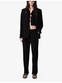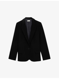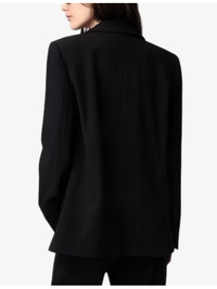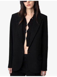 PRODUCT DETAILS - Zadig & Voltaire woven jacket - 82% acetate 18% polyester - Exposed button fastenings at front - Peak lapels, single-breasted, padded shoulders, regular-fit, darts at front, two flap pockets at front, branded buttons, single-vent at back, partially lined, curved hem - Dry clean - True to size - Size UK 8: length 28in / 72cm - Midweight, non-stretch Ref: R03909410