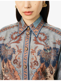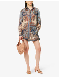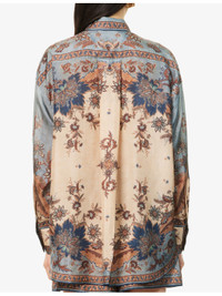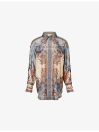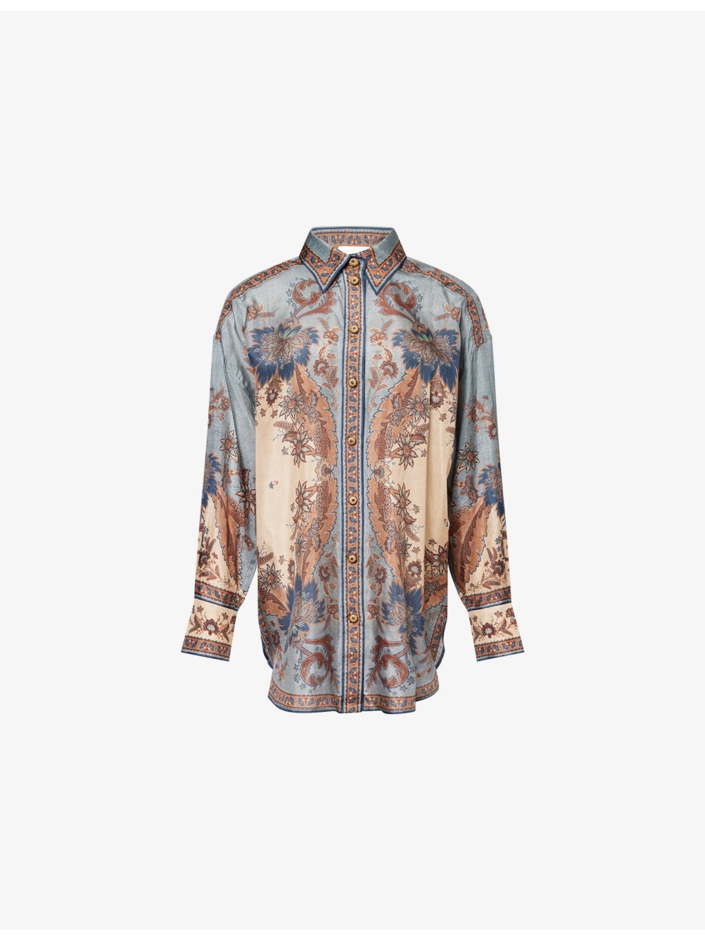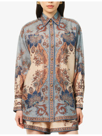 PRODUCT DETAILS - Zimmermann silk shirt - 100% silk - Exposed button fastening at front - Relaxed fit, pointed collar, long sleeves, buttoned cuffs, box pleat at back, all-over graphic pattern - Dry clean only - True to size - Size small: length 30in / 78cm - Model is 5ft 10in/1.78m and wears a size small - Lightweight, non-stretch Ref: R04465556