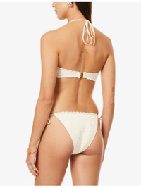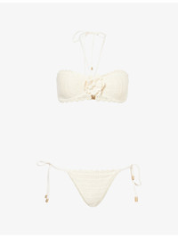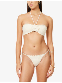 PRODUCT DETAILS - Zimmermann bikini - 100% cotton; lining 92% nylon, 8% elastane - Self-tie fastening at back and sides - Top: bandeau style, halterneck, flower applique at front, all-over crochet pattern - Bottoms: mid-rise, all-over crochet pattern, medium coverage at back - Hand wash cold - True to size - Model is 5ft 10in/1.78m and wears a size UK 8 - Lightweight, stretchy - For hygiene reasons, we are unable to exchange or refund this product, unless faulty. Ref: R04555144