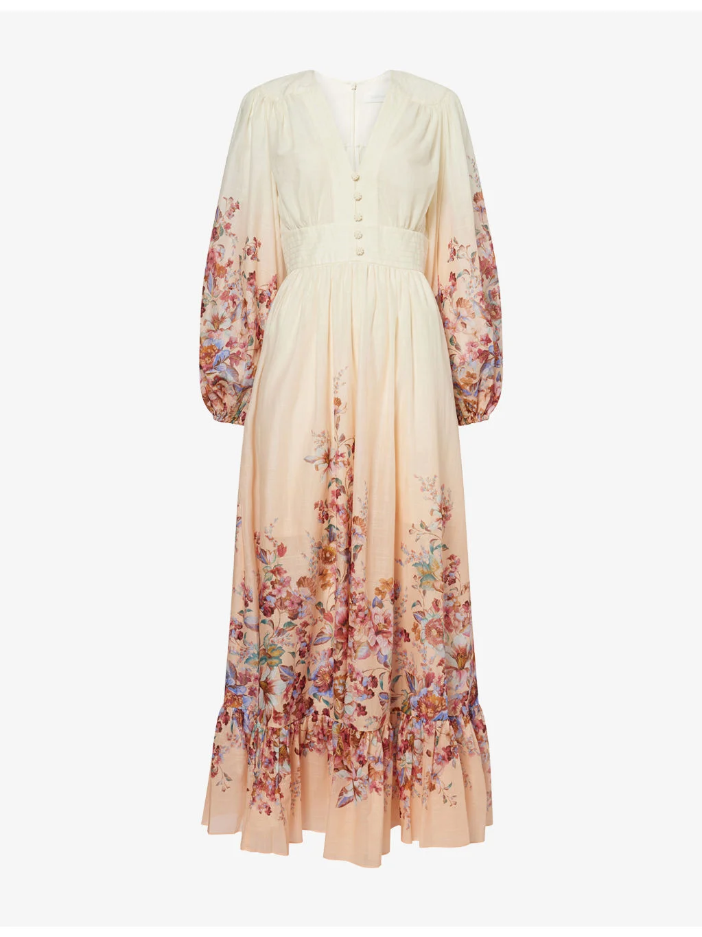 PRODUCT DETAILS - Zimmermann cotton-poplin maxi dress - 100% cotton - Concealed zip fastening at back and exposed button fastening at front - Regular fit, plunge neckline, balloon long sleeves, elasticated cuffs, all-over floral print, flared skirt, ruffled hem - Dry clean - True to size - Size small: length 54in / 137cm - Model is 5ft 10in/1.78m and wears a size small - Lightweight, stretchy Ref: R04552666