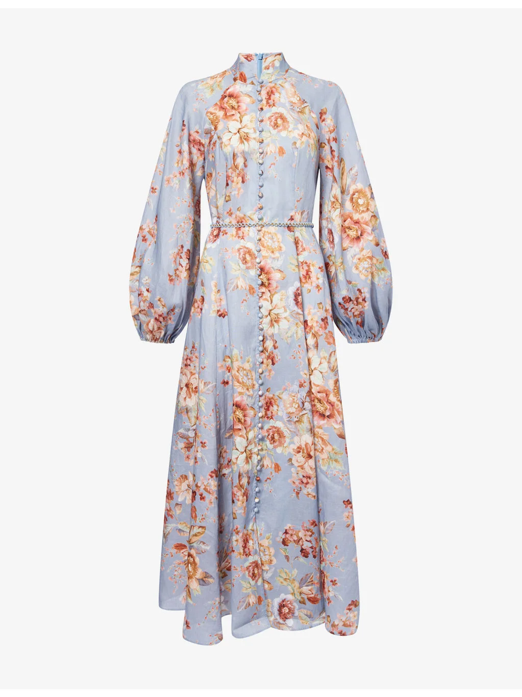 PRODUCT DETAILS - Zimmermann linen maxi dress - 100% linen - Concealed zip fastening - Regular fit, collar, long sleeves, elasticated sleeve hems, belt at waist, floral pattern, flared hem - Dry clean only - True to size - Size small: length 52in / 132cm - Model is 5ft 10in/1.78m and wears a size small - Lightweight, non-stretch Ref: R04552668