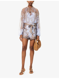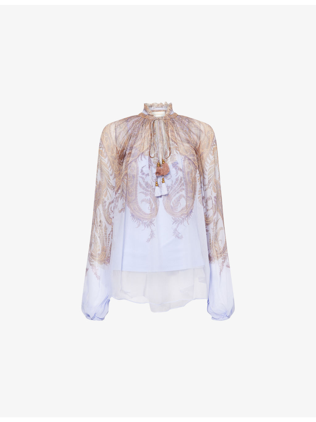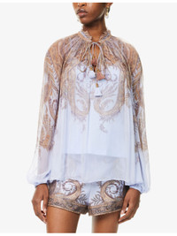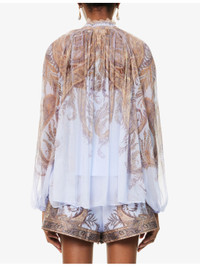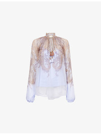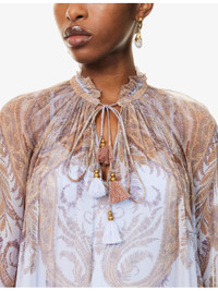 PRODUCT DETAILS - ZIMMERMANN Chiffon Blouse - 100% viscose - Pulls on - V-neck with ties,, long sleeves, loose fit, chiffon outer, printed, inner slip top - Dry clean - True to size - Model is 5ft 10in/1.78m and wears a size small - Lightweight, slight stretch Ref: R04504534