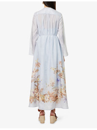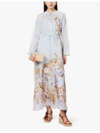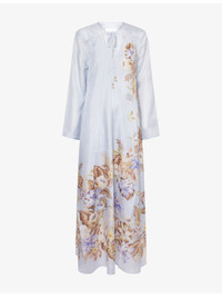 PRODUCT DETAILS - Zimmermann silk maxi dress - 100% silk; bodylining 86% recycled polyester, 14% elastane - Regular fit, round neck with self-tie fastening, long sleeves, long sleeves, gathered detail at back, removable skinny self-rouleau belt, all-over graphic print, removable slip - Dry clean only - True to size - Size small: length 56in / 142cm - Model is 5ft 11in/1.80m and wears a size small - Lightweight, non-stretch Ref: R04465616