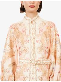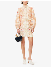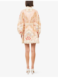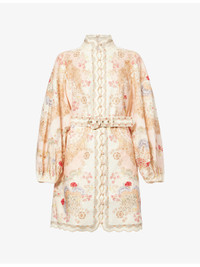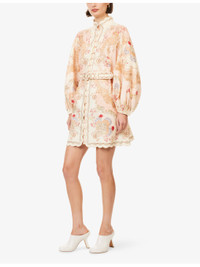 PRODUCT DETAILS - Zimmermann linen mini dress - 100% linen; contrast 100% polyester - Exposed button fastening at front and concealed zip fastening at back - Regular fit, high-neck, raglan long balloon sleeves, elasticated cuffs, belt loops, detachable belt, all-over floral print, scalloped metallised trims, flared hem - Dry clean - True to size - Size small: length 33in / 85cm - Model is 5ft 10in/1.78m and wears a size small - Lightweight, stretchy Ref: R04552683