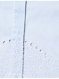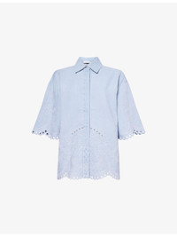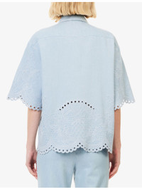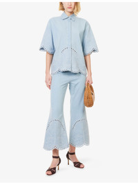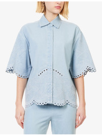 PRODUCT DETAILS - Zimmermann denim shirt - 100% cotton - Concealed button fastenings at front - Regular fit, classic collar, wide short sleeves, all-over embroidery, scalloped hem - Machine wash at 30°C - True to size - Size small: length 25.5in / 65cm - Model is 5ft 10in/1.78m and wears a size small - Midweight, non-stretch Ref: R04552688