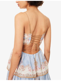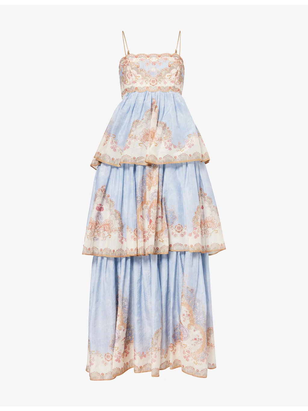 PRODUCT DETAILS - Zimmermann cotton-blend maxi dress - 72% cotton, 25% silk, 3% metallic fibres; lining 100% cotton - Concealed zip fastening and lace-up fastening at back - Regular fit, straight-across neckline, adjustable shoulder straps, high-waist, side boning, cut-out at sides and back, ruffled panels, all-over floral print, all-over metallised striped print, partially lined, scalloped trims, flared hem - Dry clean - True to size - Size small: length 54in / 137cm - Model is 5ft 10in/1.78m and wears a size small - Lightweight, stretchy Ref: R04552682