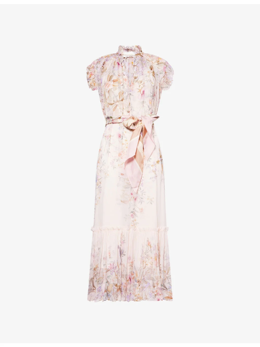 PRODUCT DETAILS - Zimmermann woven midi dress - 86% polyester, 14% elastane - Regular fit, frilled collar, self-tie straps at collar, sleeveless, matching belt, all-over floral pattern, frilled trims, interior slip - Dry clean - True to size - Size small: length 51.5in / 131cm - Model is 5ft 10in/1.78m and wears a size small - Midweight, non-stretch Ref: R04552649