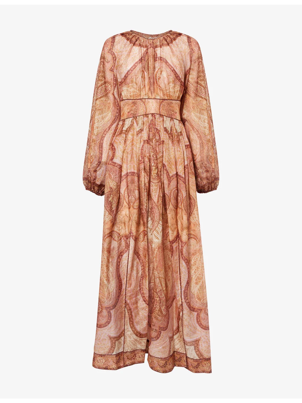 PRODUCT DETAILS - Zimmermann cotton-blend midi dress - 72% cotton, 25% silk, 3% metallic fibres - Concealed zip fastening - Regular fit, round neckline, long sleeves, floral pattern, metallic thread weave, flared hem, lined - Dry clean only - True to size - Size small: length 57in / 145cm - Model is 5ft 10in/1.78m and wears a size small - Lightweight, non-stretch Ref: R04552674
