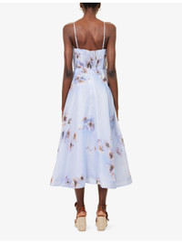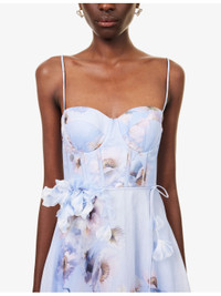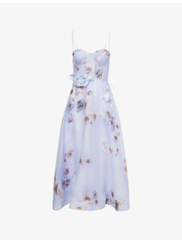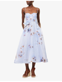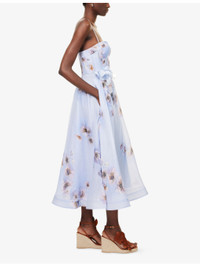 PRODUCT DETAILS - Zimmermann linen and silk midi dress - 53% linen, 47% silk; lining 100% cotton - Concealed zip fastening at back - Regular fit, sweetheart neckline, adjustable shoulder straps, corset boning, padded cups, shirred panel at back, belt loops, flower-embellished belt, all-over floral print, fully lined, flared hem - True to size - Dry clean - Size small: length 47in / 120cm - Model is 5ft 10in/1.78m and wears a size small - Lightweight, slight stretch Ref: R04504536