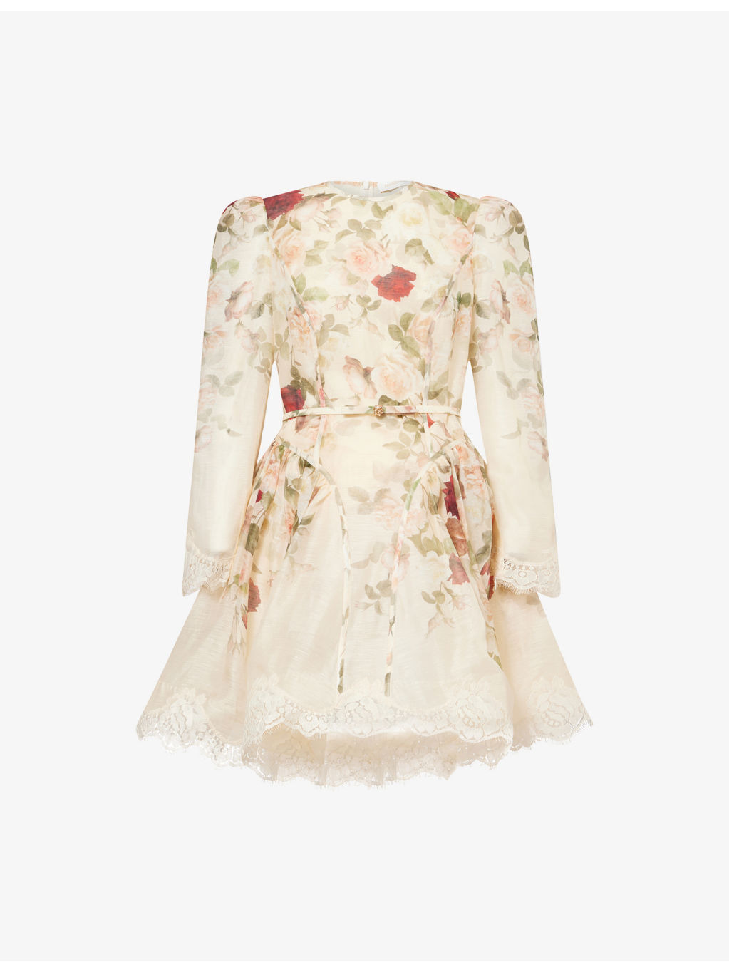 PRODUCT DETAILS - Zimmermann linen and silk mini dress - 53% linen, 47% silk; contrast 100% polyester; lining 100% cotton - Concealed zip fastening at back - Regular fit, round-neck, puffed shoulders, long sleeves, belt loops, detachable belt, lace embroidered trims, fully lined, flared hem - True to size - Dry clean - Size small: length 33in / 84cm - Model is 5ft 10in/1.78m and wears a size small - Lightweight, slight stretch Ref: R04504510