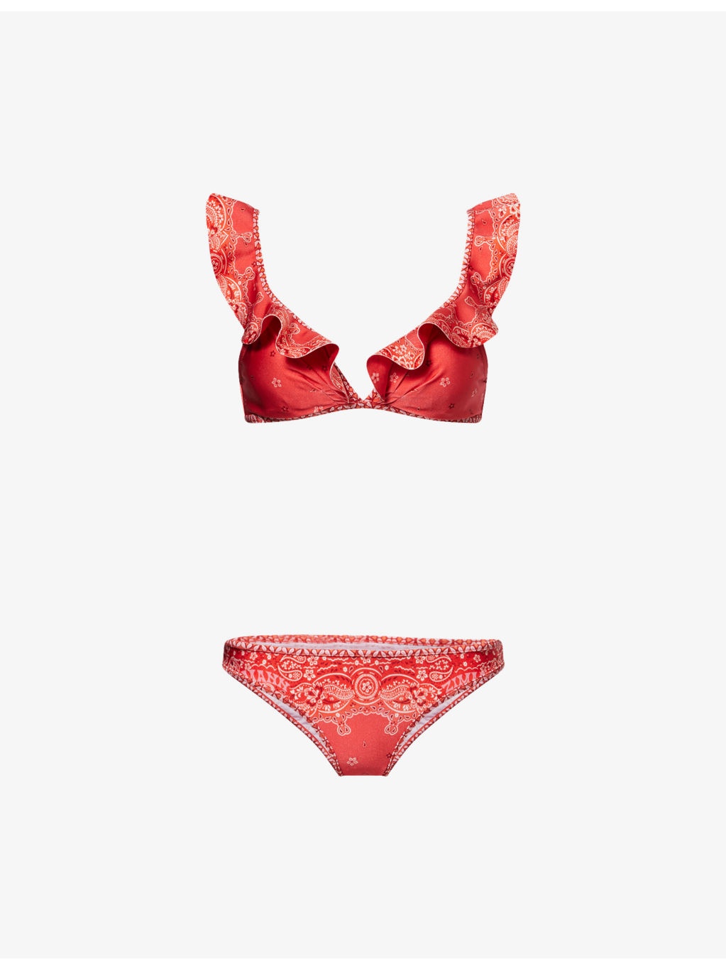 PRODUCT DETAILS - Zimmermann bikini set - 80% polyamide, 20% elastane - Hook-and-eye fastening - Top: Triangle shape, removable pads at cups, adjustable straps, frill trim - Bottom: Mid-rise, elasticated waistband, moderate rear coverage - Machine wash cold - True to size - Model is 5ft 10in/1.78m and wears a size small - Lightweight, stretchy - For hygiene reasons, we are unable to exchange or refund this product if the protective adhesive strip has been removed. Ref: R04456945