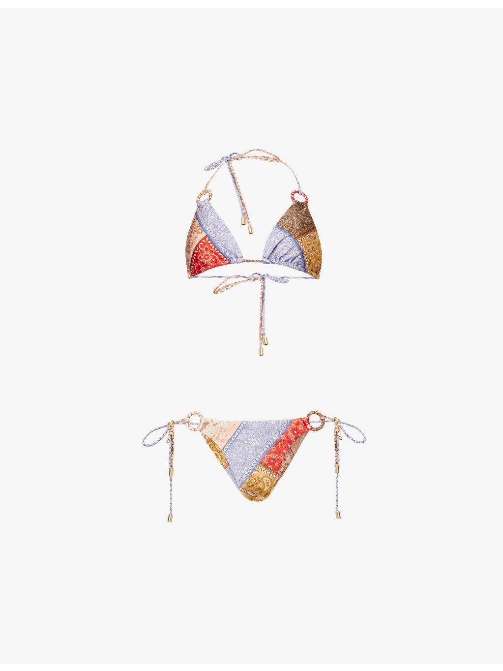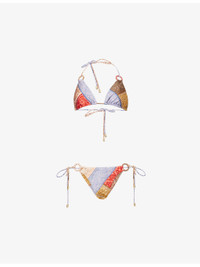 PRODUCT DETAILS - Zimmerman bikini set - 80% polyamide, 20% elastane; lining 92% polyamide, 8% elastane - Self-tie fastening - Top: triangle cups, self-tie straps, embroidered knit, O-ring detail, all-over graphic print - Bottom: high leg, elasticated waistband, self-tie at sides, all-over graphic print, minimal coverage - Hand wash - True to size - Model is 5ft 11in/1.80m and wears a size 2 - Lightweight, stretchy - For hygiene reasons, we are unable to exchange or refund this product if the protective adhesive strip has been removed. Ref: R04456946