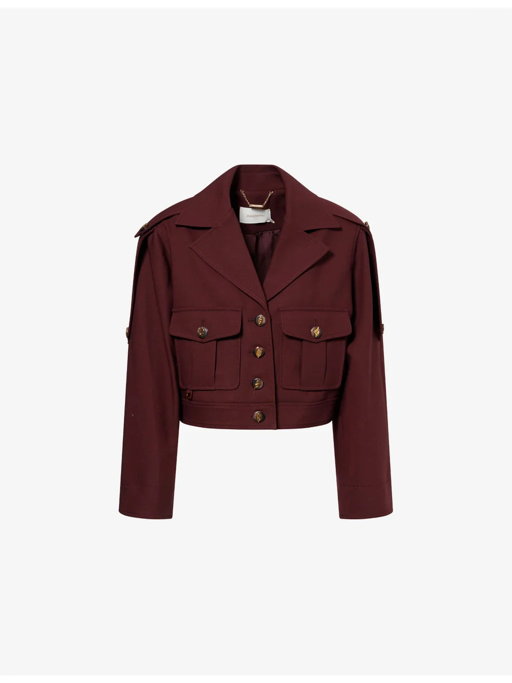 PRODUCT DETAILS - Zimmermann wool jacket - 98% wool, 2% elastane - Button fastening - Relaxed fit, notched collar, long sleeves, buttoned straps at shoulders and sleeve hems, flap pockets at front, gold-tone buttons, lined, cropped length - Dry clean - True to size - Size small: length 49cm - Model is 5ft 10in/1.78m and wears a size small - Midweight, non-stretch Ref: R04607624