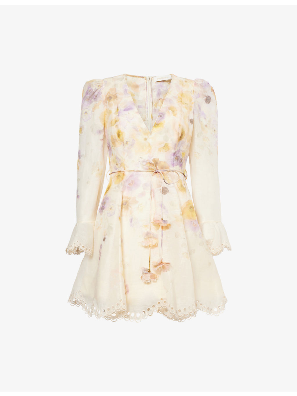 PRODUCT DETAILS - Zimmermann linen and silk mini dress - 53% linen, 47% silk; lining 100% cotton - Concealed zip fastening at back - Regular fit, V-neck, puffed long sleeves, flared cuffs, belt loops, detachable belt, darts at front and back, all-over floral print, fully lined, embroidered trims, flared hem - Dry clean only - True to size - Size small: length 32in / 82cm - Model is 5ft 10in/1.78m and wears a size small - Lightweight, slight stretch Ref: R04504543