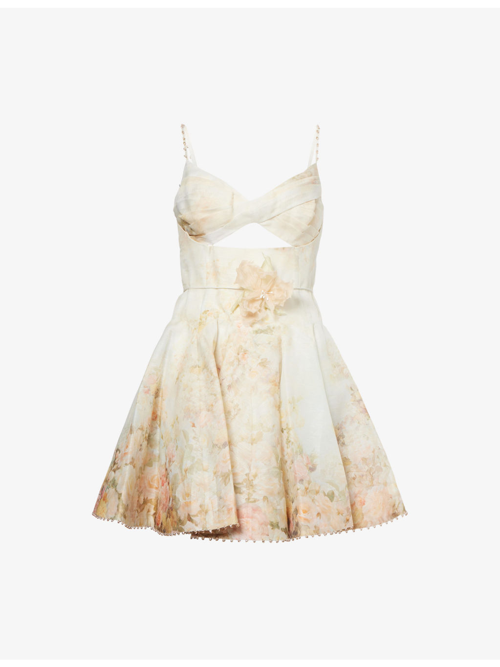 PRODUCT DETAILS - Zimmermann linen and silk mini dress - 53% linen, 47% silk; contrast 100% polyester; lining 100% cotton - Concealed zip fastening at back - Regular fit, V-neck, adjustable shoulder straps, pleated and twisted panels at front, cut-out at front, belt loops, detachable belt, two slip pockets at front, shirred panel at back, pleated skirt, all-over floral print, fully lined, crystal embellished trims - Dry clean - True to size - Size small: length 33in / 85cm - Model is 5ft 10in/1.78m and wears a size small - Lightweight, slight stretch Ref: R04504549