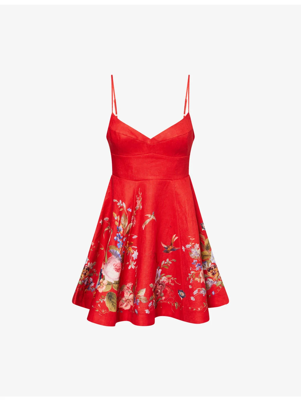 PRODUCT DETAILS - Zimmermann linen mini dress - 100% linen - Concealed zip fastening - Regular fit, V-neckline, sleeveless, adjustable straps, shirred panel at back, floral pattern, slip pockets at front, flared hem - Dry clean - True to size - Size small: length 29in / 74cm - Model is 5ft 10in/1.78m and wears a size UK 8 - Lightweight, non-stretch Ref: R04552690
