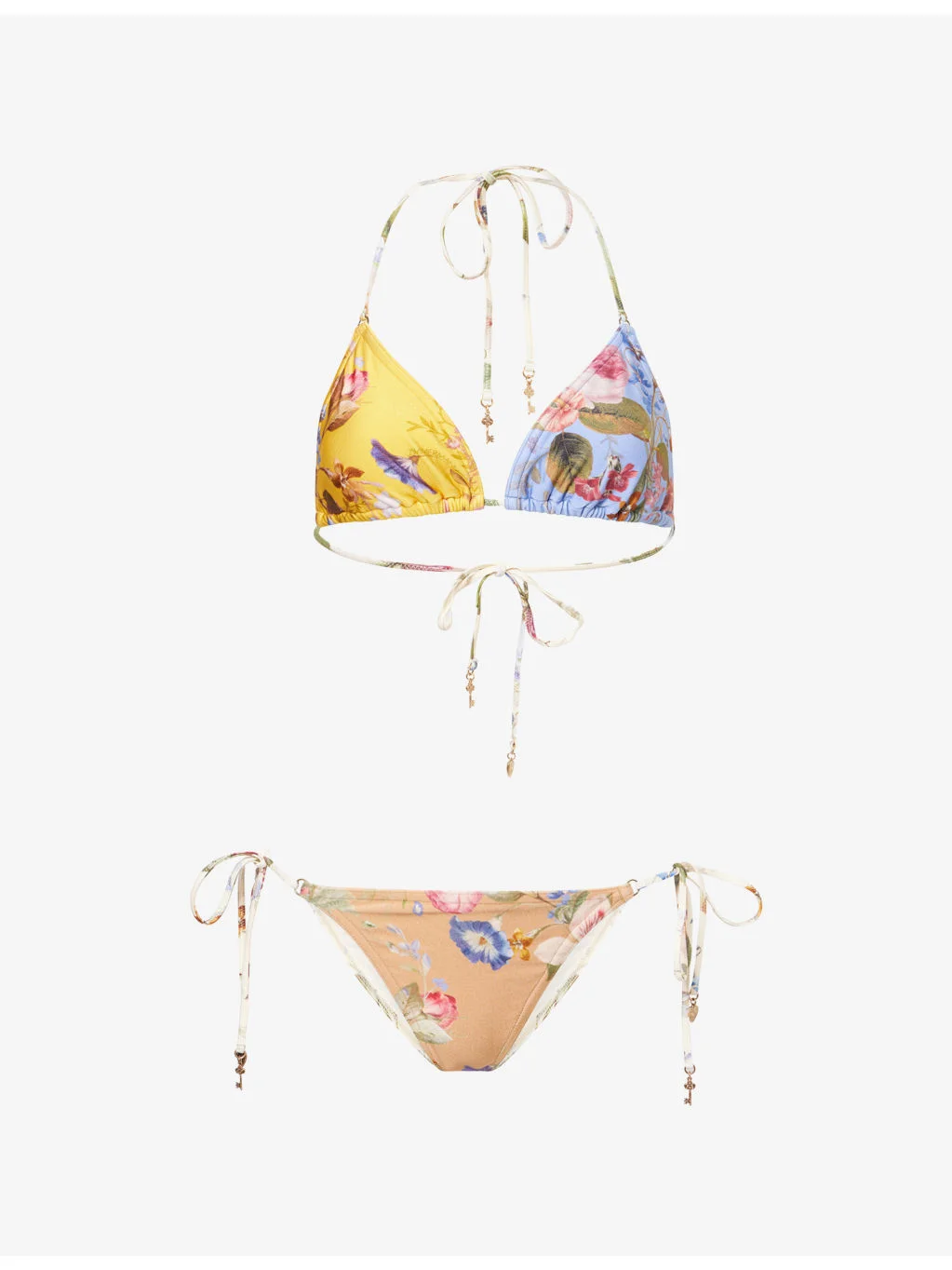 PRODUCT DETAILS - Zimmermann bikini set - 80% polyamide, 20% elastane - Top: Triangle shape, self-tie with charms, spliced pattern - Bottom: Mid-rise, self-tie at sides with charm, spliced pattern, moderate rear coverage - Hand wash cold - True to size - Model is 5ft 10in/1.78m and wears a size small - Lightweight, stretchy - For hygiene reasons, we are unable to exchange or refund this product if the protective adhesive strip has been removed. Ref: R04555159
