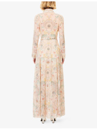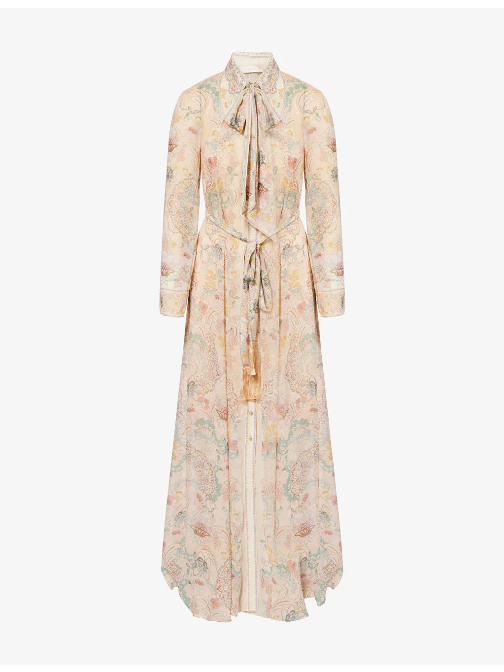 PRODUCT DETAILS - Zimmermann woven midi dress - 100% viscose - Button fastening - Regular fit, collar, self-tie at neck, long sleeves, floral pattern - Dry clean - True to size - Size small: length 60in - Model is 5ft 10in/1.78m and wears a size small - Lightweight, non-stretch Ref: R04552656