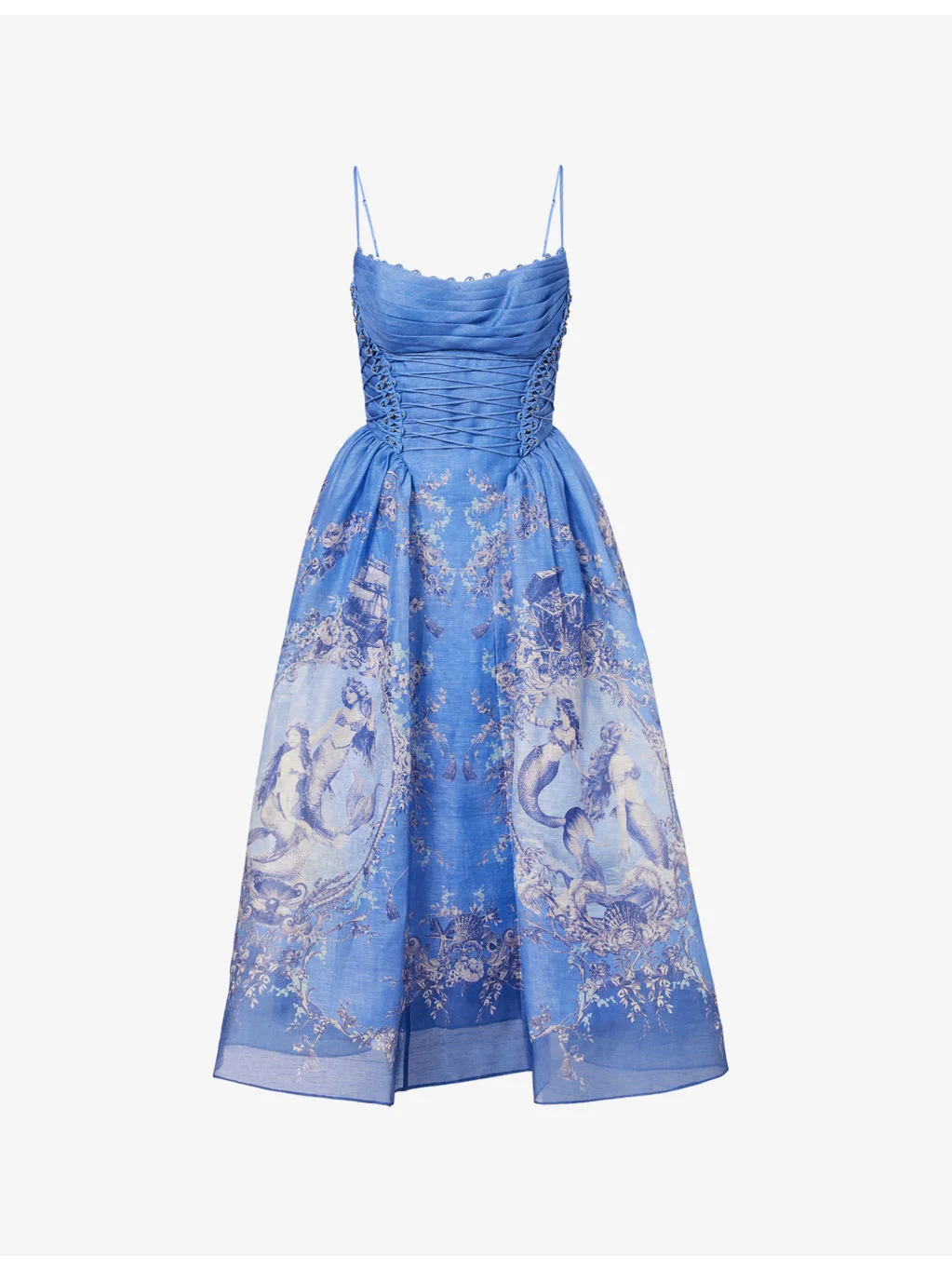 PRODUCT DETAILS - Zimmermann linen and silk maxi dress - 55% linen, 45% silk; contrast 100% polyester; lining 100% cotton - Concealed zip fastening at back - Regular fit, scoop-neck, adjustable shoulder straps, pleated top, laces at front and sides, beads embellishment at front and back, shirred panel at back, structured hips, all-over graphic print, fully lined, flared hem - Dry clean - True to size - Size small: length 48in / 122cm - Model is 5ft 10in/1.78m and wears a size small - Lightweight, slight stretch Ref: R04552645