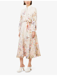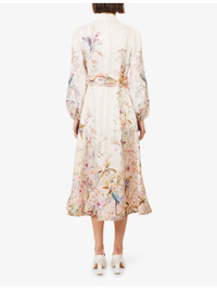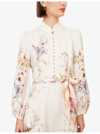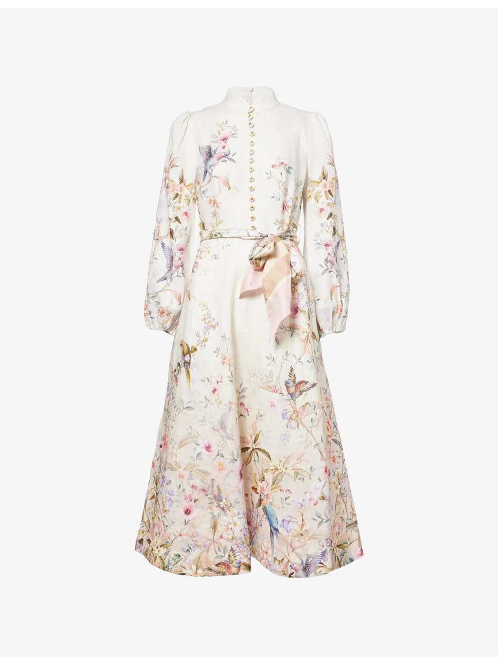 PRODUCT DETAILS - Zimmermann linen midi dress - 100% linen; contrast 100% polyester; embellishments 100% silk - Exposed button fastening at front and concealed zip fastening at back - Regular fit, band-collar, puffed long sleeves, elasticated cuffs, belt loops, detachable satin belt, two slip pockets at front, all-over floral and bird print, flared hem - Dry clean - True to size - Size small: length 48in / 122cm - Model is 5ft 10in/1.78m and wears a size small - Lightweight, stretchy Ref: R04552648