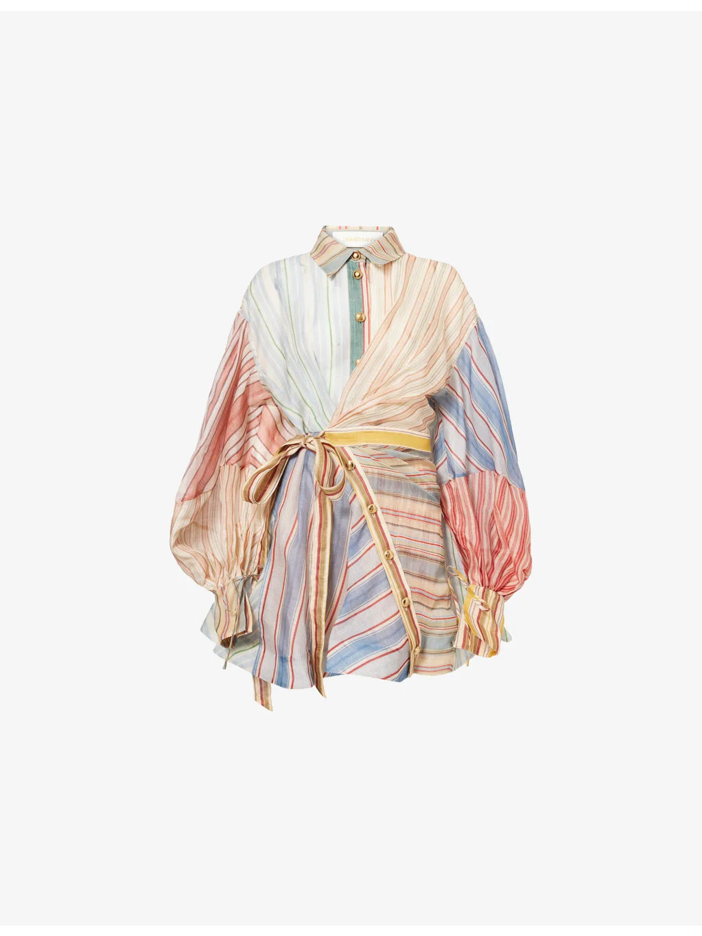 PRODUCT DETAILS - Zimmermann linen and silk mini dress - 55% linen, 45% silk; lining 100% cotton - Exposed button fastening at front - Regular fit, spread collar, long balloon sleeves, self-tie fastening at buttoned cuffs, wrap-front panel, all-over striped print, all-over contrast panels, partially lined, flared hem - Dry clean - True to size - Size small: length 30in / 76cm - Model is 5ft 10in/1.78m and wears a size small - Lightweight, stretchy Ref: R04552638