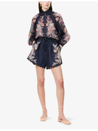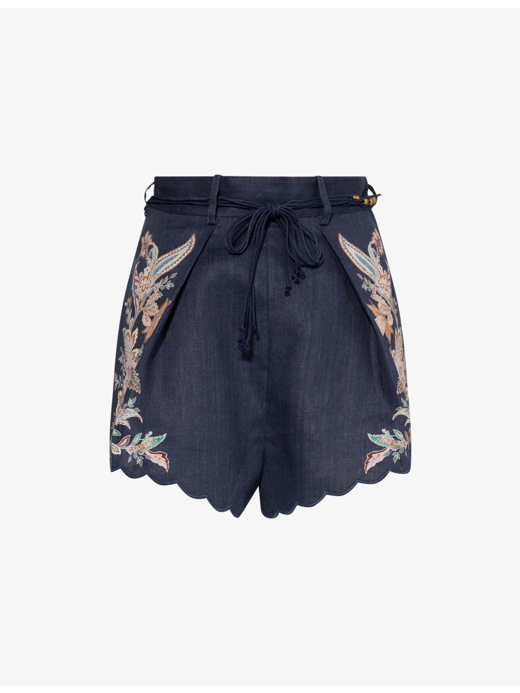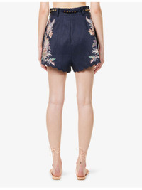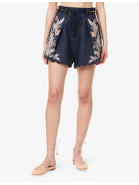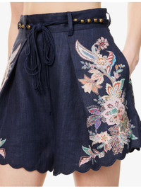 PRODUCT DETAILS - Zimmermann linen shorts - 100% linen; embroidery 100% polyester; lining 100% cotton - Concealed zip fastening at back - Relaxed fit, high-rise, belt loops, beaded self-tie fastening belt, two slip pockets and pleated at front, darts at back, floral print at front and back, fully lined, scalloped cuffs - Dry clean - True to size - Size small: rise 17in / 43cm, inside leg 2in / 5cm, leg opening 32in / 81cm - Model is 5ft 10in/1.78m and wears a size small - Lightweight, slight stretch Ref: R04465614