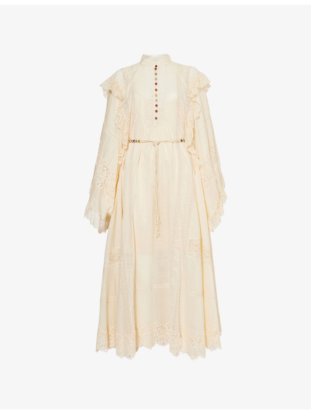 PRODUCT DETAILS - Zimmermann cotton-poplin midi dress - 100% cotton; contrast 90% polyamide, 10% cotton; lining 86% polyester, 14% elastane; trims 100% cotton - Concealed zip fastening at back and exposed button fastening at front - Relaxed fit, band-collar, wide long sleeves, elasticated waistband, detachable cord and beaded belt, all-over lace embroidery, removable lining, frilled trims - Dry clean - True to size - Size small: length 51in / 130cm - Model is 5ft 10in/1.78m and wears a size small - Lightweight, stretchy Ref: R04465604