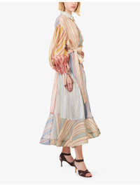 PRODUCT DETAILS - Zimmermann linen-and-silk midi dress - 55% linen, 45% silk - Button fastening at front - Regular fit, classic collar, billow sleeves, voluminous buttoned cuffs, wrap style, all-over striped pattern - Dry clean only - True to size - Size small: length 49.5in / 126cm - Model is 5ft 10in/1.78m and wears a size small - Lightweight, non-stretch Ref: R04552639