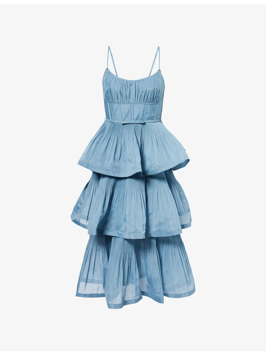 PRODUCT DETAILS - Zimmermann woven midi dress - 100% polyester; lining 100% cotton - Concealed zip fastening - Slim fit, curved neckline, sleeveless, adjustable straps, corset bodice, tiered hem - Dry clean only - True to size - Size small: length 43in / 109cm - Model is 5ft 10in/1.78m and wears a size small - Lightweight, non-stretch Ref: R04552664
