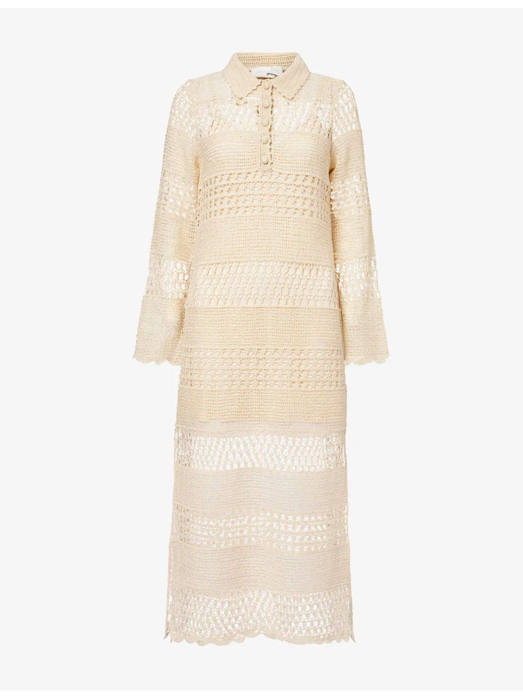PRODUCT DETAILS - Zimmermann cotton-blend maxi dress - 83% cotton, 9% polyester, 8% polyamide; lining 86% polyester, 14% elastane - Exposed button fastening at front - Regular fit, spread-collar, long sleeves, all-over crochet pattern, removable lining, split at sides - Dry clean only - True to size - Model is 5ft 10in/1.78m and wears a size UK 8 - Midweight, stretchy Ref: R04555150